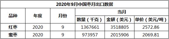 2020年9月中国枣月出口数据